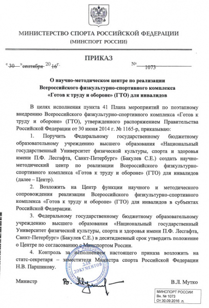 Приказом Министра спорта Российской Федерации от 30 сентября 2016 года №1073 на базе НГУ им. П.Ф. Лесгафта, Санкт-Петербург создан Научно-методический центр по реализации Всероссийского физкультурно-спортивного комплекса «Готов к труду и обороне» (ГТО) для инвалидов.