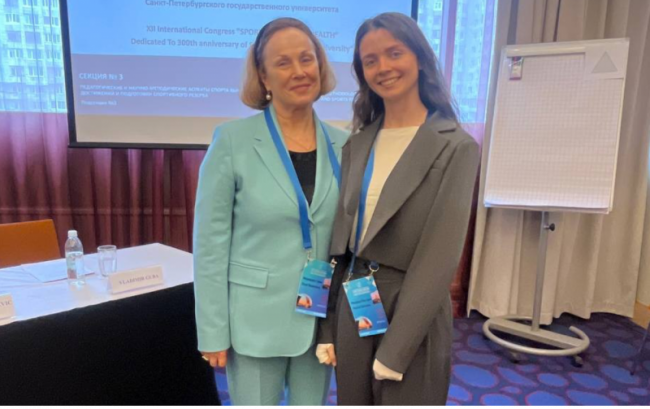 Виктория Макарова и Елизавета Соболева, выпускницы и преподаватели кафедры теории и методики художественной гимнастики и спортивных танцев НГУ им. П.Ф. Лесгафта.