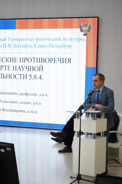 Доктор педагогических наук, доцент Алексей Баряев (НГУ им. П.Ф. Лесгафта), член научного комитета конгресса и модератор пленарных заседаний, представил доклад "Терминологические противоречия в паспорте научной специальности 5.8.4.". Доклад был посвящен анализу нормативно-правовой базы в сфере физической культуры и спорта, выявлению терминологической неопределенности и дублирования, препятствующих эффективному функционированию системы научной аттестации кадров высшей квалификации.