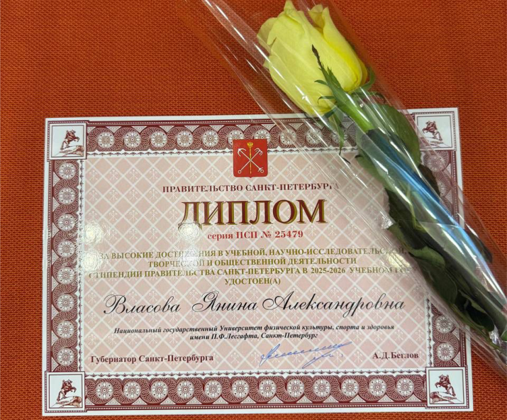 Особым моментом стало награждение за выдающиеся успехи в учебе и общественной жизни. Среди тех, кто удостоился этой высокой награды, гордостью для НГУ им. П.Ф. Лесгафта стала Янина Власова, студентка 2 курса магистратуры факультета летних видов спорта кафедры теории и методики художественной гимнастики и спортивных танцев. Янина была отмечена дипломом Правительства за выдающиеся достижения в научной и исследовательской деятельности.