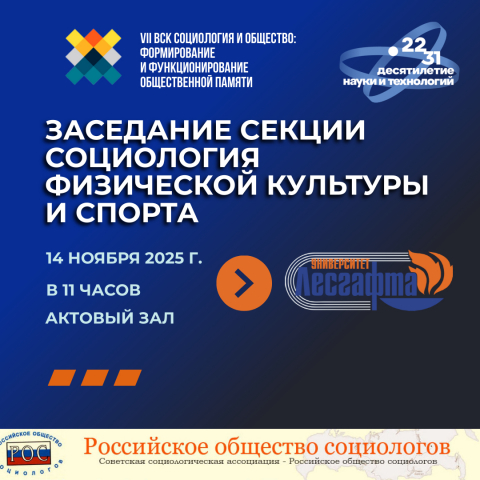 Приглашаем принять участие в заседании секции "Социология физической культуры и спорта", которое состоится 14 ноября 2025 года в 11:00 в Актовом зале в рамках VII Всероссийского социологического Конгресса "Социология и общество: формирование и функционирование общественной памяти".